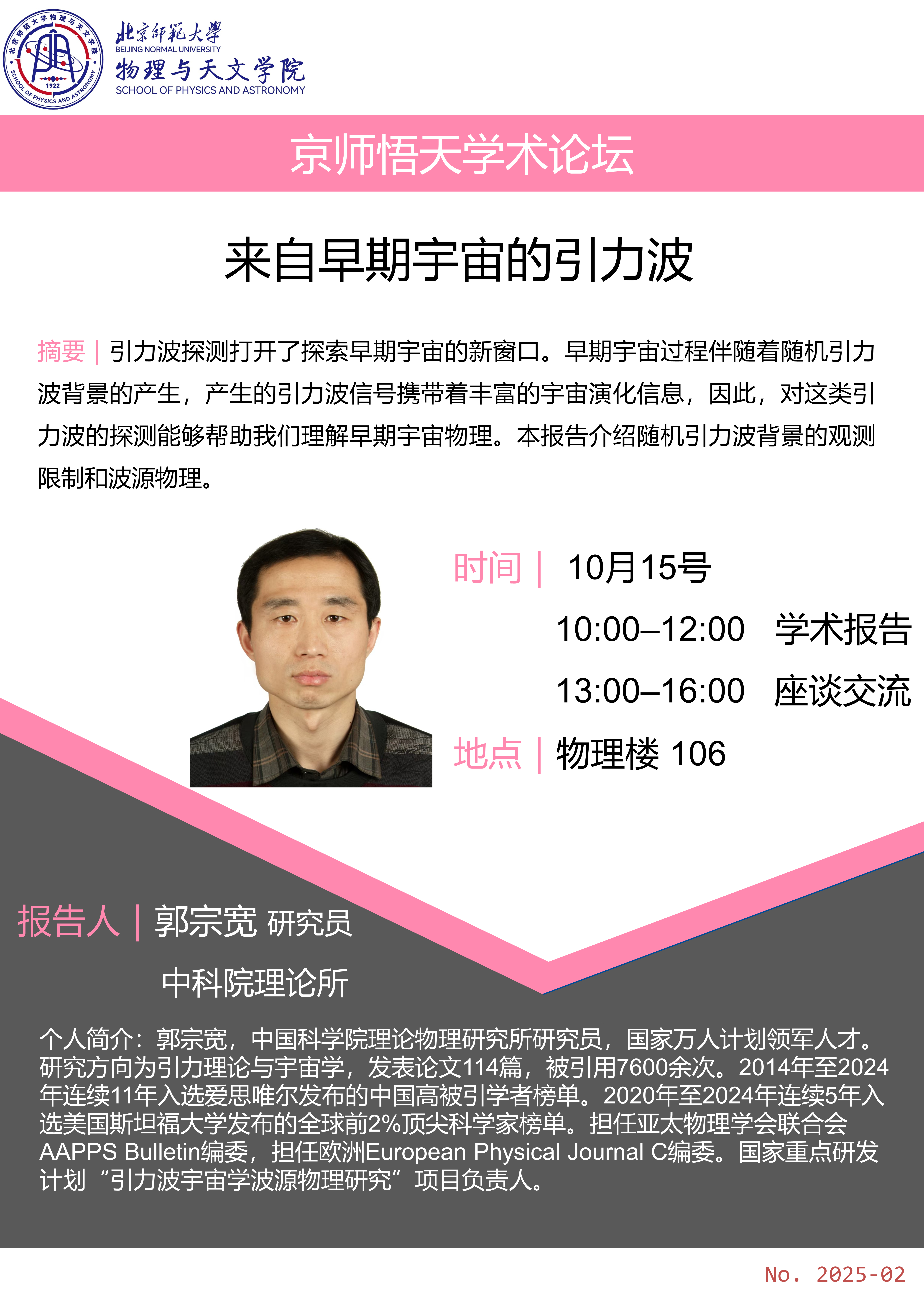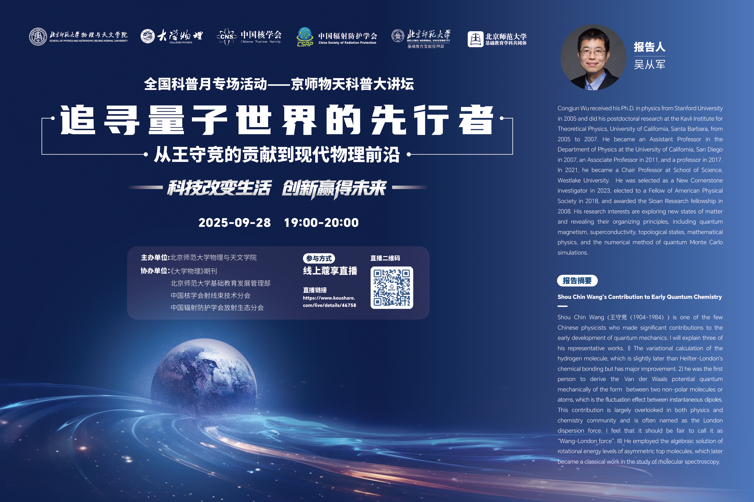2025年9月28日,在全国科普月“科技改变生活,创新赢得未来”的主题引领下,北京师范大学物理与天文学院成功举办了京师物天科普大讲坛线上专场活动。本次活动特邀西湖大学讲席教授、美国物理学会会士、新基石研究员吴从军教授,带来主题为“追寻量子世界的先行者——从王守竞的贡献到现代物理前沿”的精彩讲座。来自全国多所中学、北京师范大学附属基础教育学校、高校及科研院所的近万名师生与科技爱好者相聚云端,共同聆听这场跨越百年的科学对话。