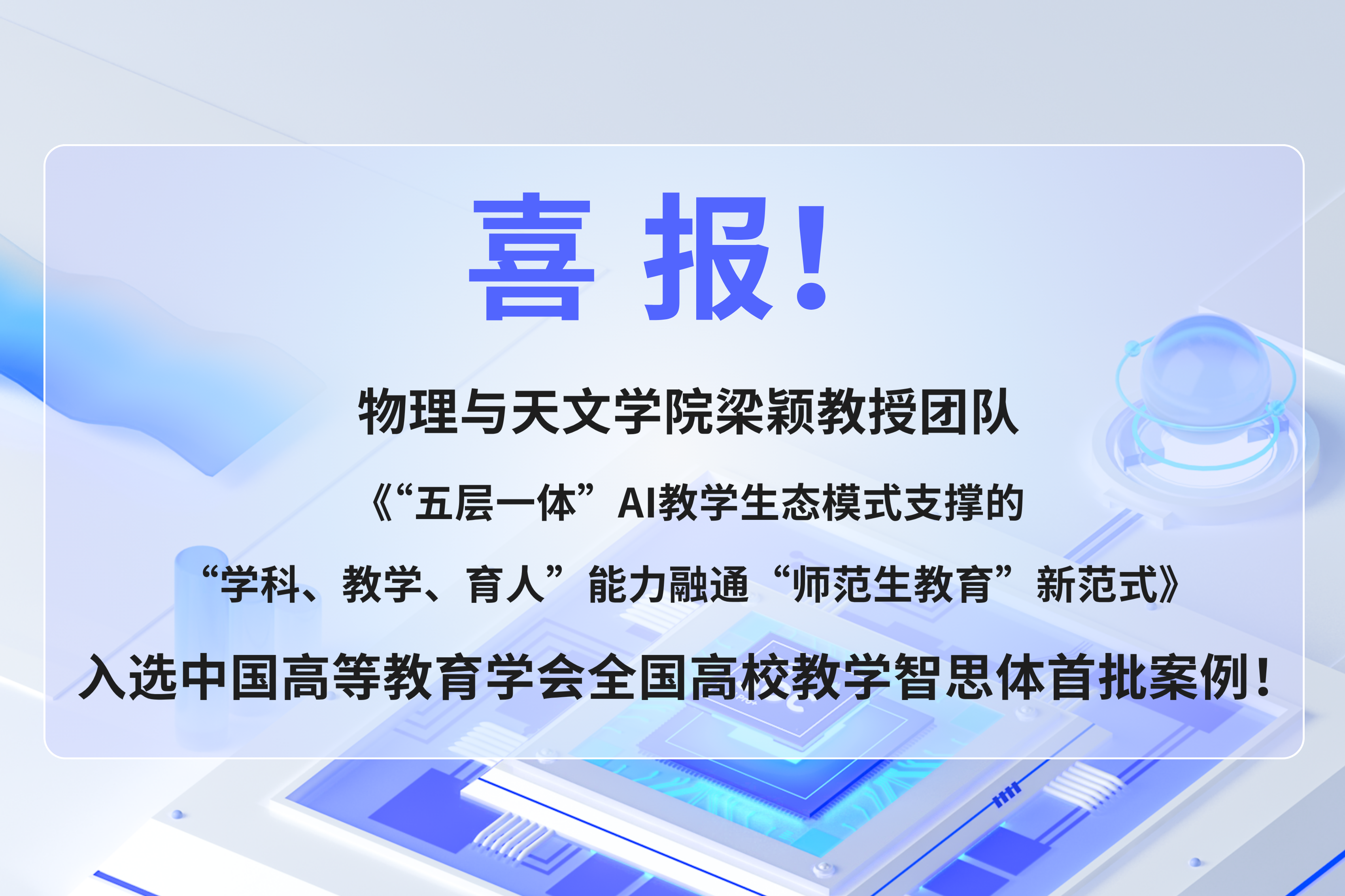 近日,中国高等教育学会正式发布第一批 “高校教学智思体工具及应用案例” 征集名单,我院梁颖教授团队撰写的《“五层一体” AI 教学生态模式支撑的 “学科、教学、育人” 能力融通 “师范生教育” 新范式》成功入选,成为全国高校教育数字化转型创新实践的标杆代表。
