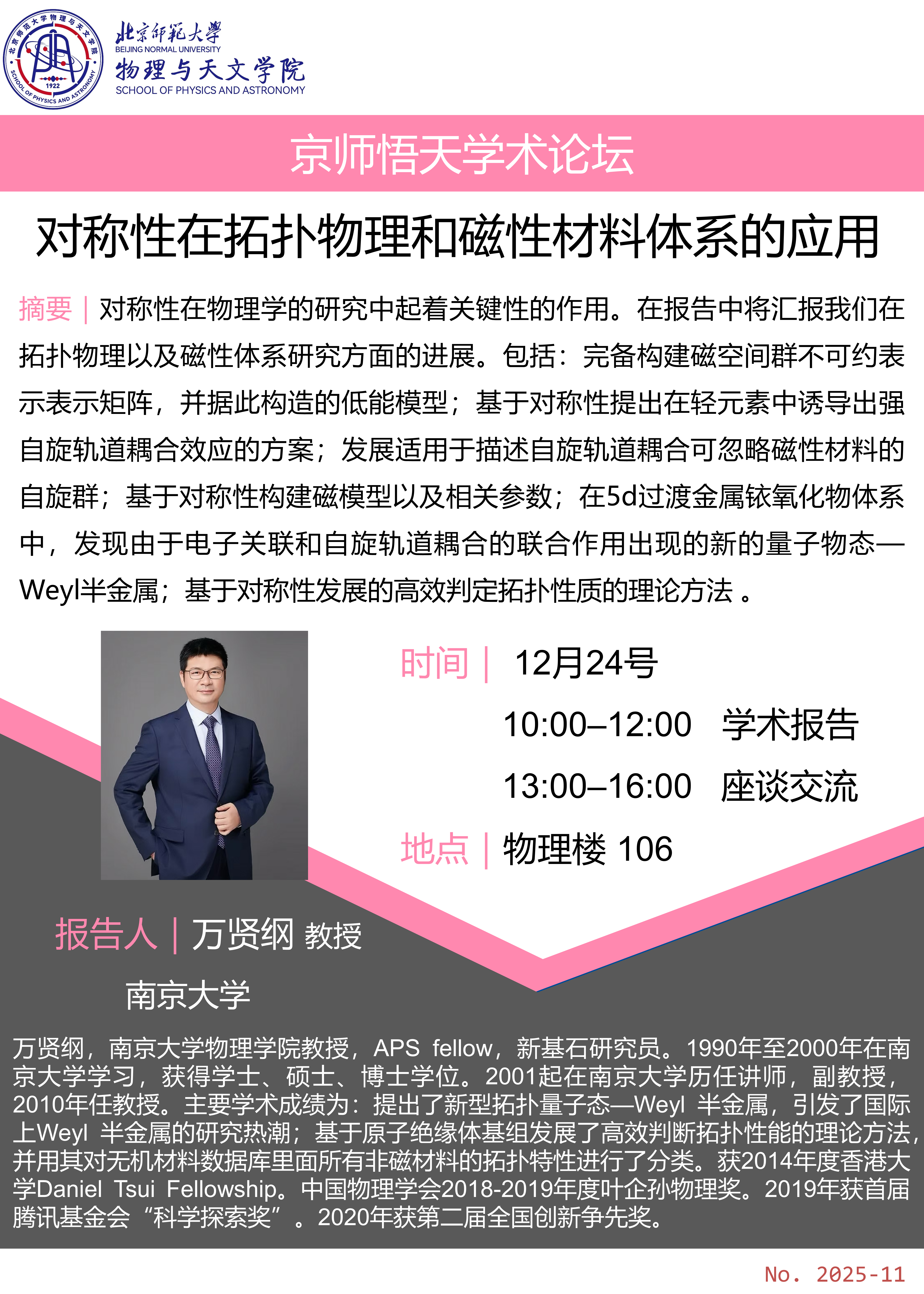 摘要:对称性在物理学的研究中起着关键性的作用。在报告中将汇报我们在拓扑物理以及磁性体系研究方面的进展。包括:完备构建磁空间群不可约表示表示矩阵,并...
