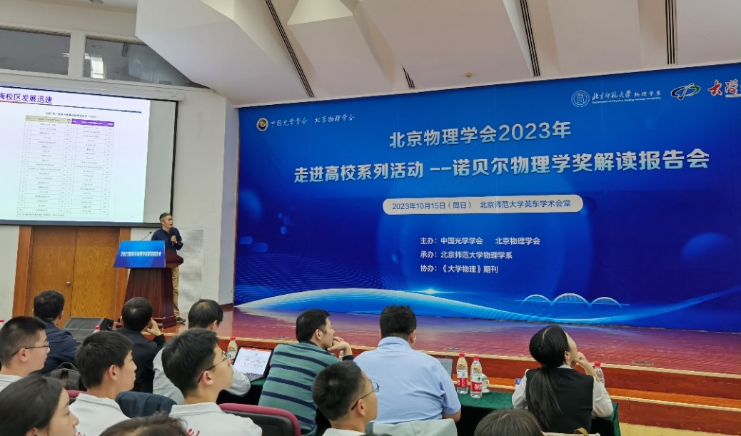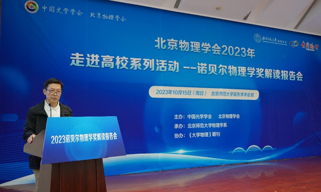 2023年10月15日,北京师范大学英东学术会堂迎来了一场前沿科学的盛会,备受瞩目的“诺贝尔物理学奖解读报告会”在这里隆重举行。此次活动由中国光学学会和北京物理学会联合主办,北京师范大学承办,《大学物理》期刊协办,这场穿越时空的阿秒光脉冲之旅,吸引了众多学生、教师、专家前来聆听,线上线下参会人数达到了上万人。中国光学学会副理事长、北京大学博雅特聘教授刘运全,北京物理学会副秘书长秦晓文,北京师范大学基础教育发展管理部副部长田军,北京师范大学基础教育发展管理部改革试验办公室王健,北京师范大学物理学系党政班子成员出席活动。