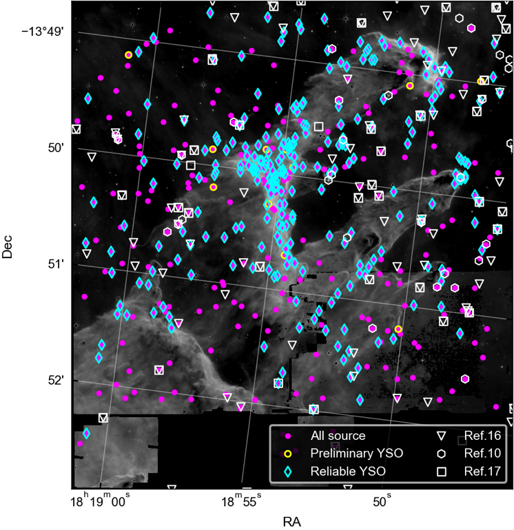 △图2 本研究筛选出的候选年轻恒星体。其中,青色菱形点代表了253个可靠的年轻恒星体候选者;黄色圆圈点则为需要进一步确认的初步候选体。作为对比,图中的白色符号标记了此前研究在该区域发现的少量年轻恒星,其数量远少于本次发现。这张图像清晰地显示,大量新发现的年轻恒星体候选者(图中以青色菱形点标示)并非随机散布,而是高度密集地排列在“创生之柱”的轮廓边缘。这种如同被“勾勒”出来的空间分布模式,与恒星反馈压缩星云物质并触发新恒星诞生的理论预测相吻合。本图摘自发表论文中图1。