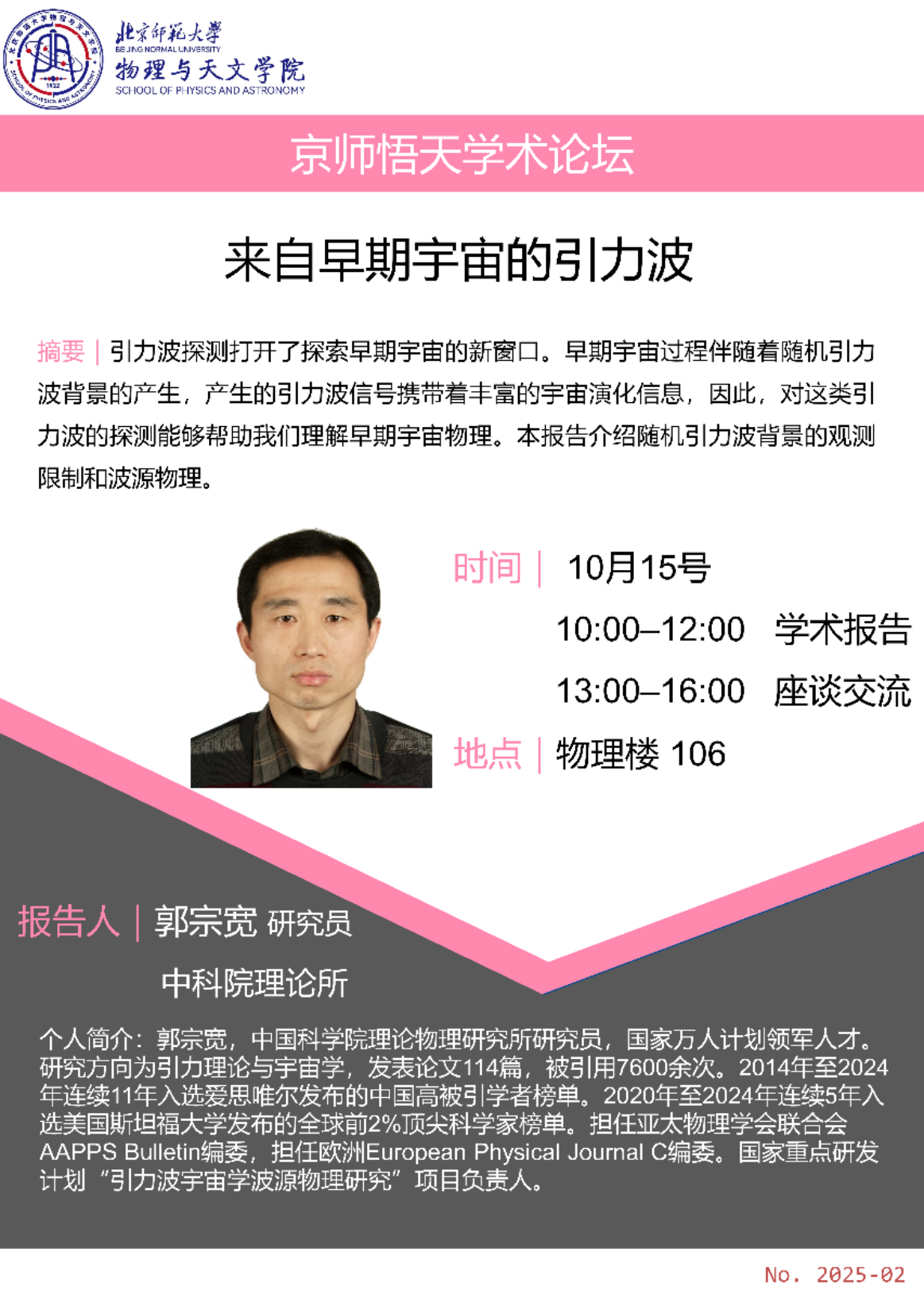 郭宗宽,中国科学院理论物理研究所研究员,国家万人计划领军人才。研究方向为引力理论与宇宙学,发表论文114篇,被引用7600余次。2014年至2024年连续11年入选爱思唯尔发布的中国高被引学者榜单。2020年至2024年连续5年入选美国斯坦福大学发布的全球前2%顶尖科学家榜单。担任亚太物理学会联合会AAPPS Bulletin编委,担任欧洲European Physical Journal C审稿编辑。国家重点研发计划“引力波宇宙学波源物理研究”项目负责人。