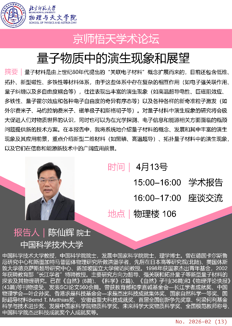 博观而约取,厚积而薄发。为进一步推动高水平学术交流,促进前沿科研思想的交汇融合,北京师范大学物理与天文学院自2025年秋季学期起正式启动“京师悟天”学术论坛。2026年春季学期,我院将继续常态化举办该系列论坛。
