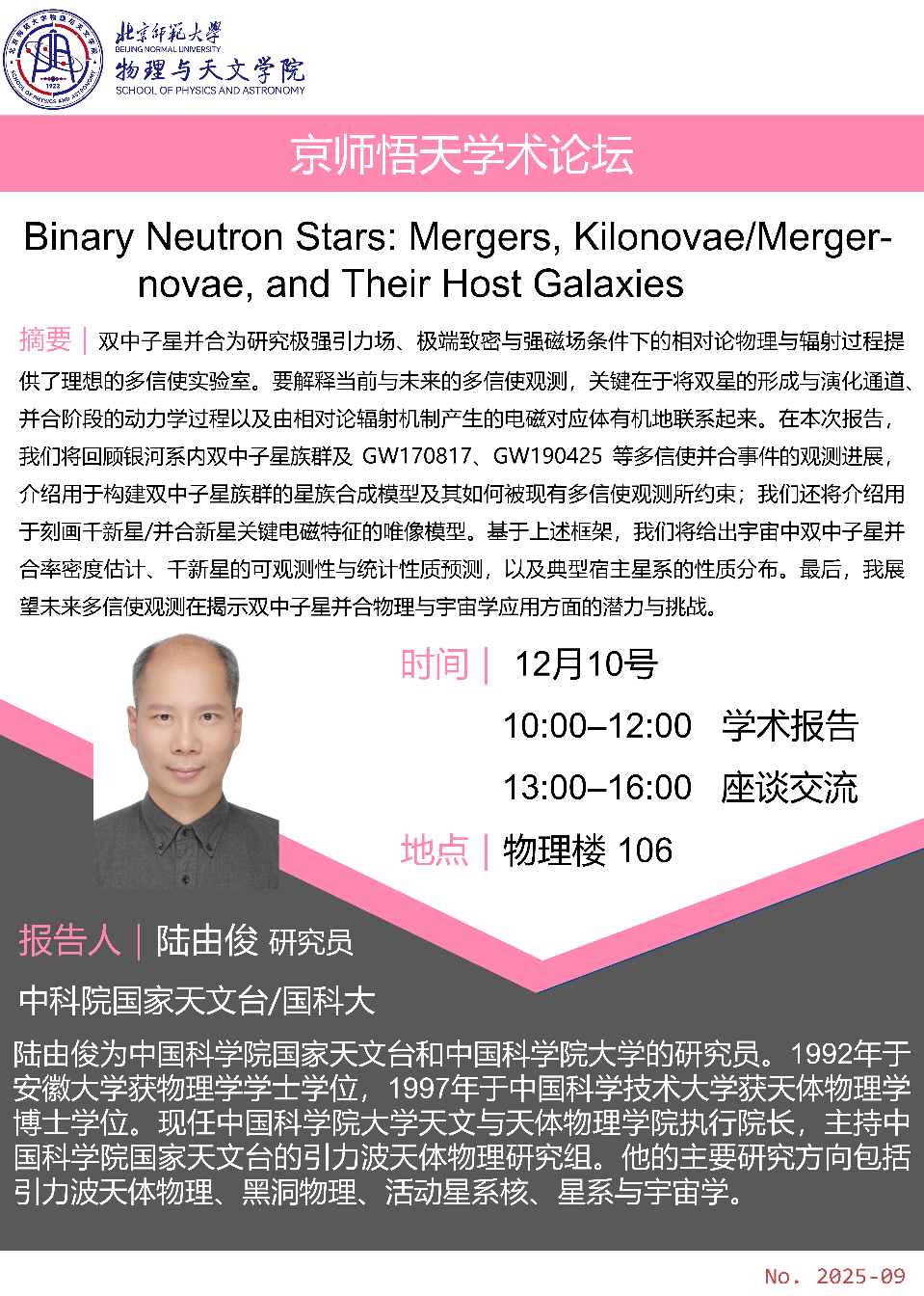 本次活动为“京师悟天学术论坛”第九期,面向全院师生开放,欢迎感兴趣的老师和同学踊跃参加。