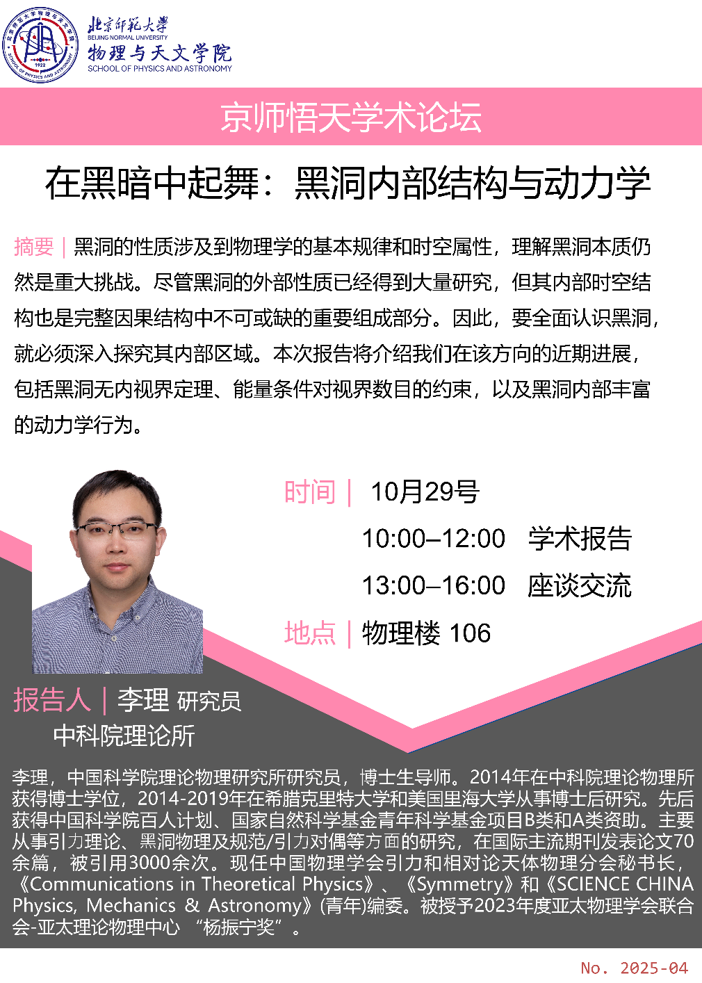 李理,中国科学院理论物理研究所研究员,博士生导师。2014年在中科院理论物理所获得博士学位,2014-2019年在希腊克里特大学和美国里海大学从事博士后研究。先后获得中国科学院百人计划、国家自然科学基金青年科学基金项目B类和A类资助。主要从事引⼒理论、⿊洞物理及规范/引⼒对偶等⽅⾯的研究,在国际主流期刊发表论文70余篇,被引用3000余次。现任中国物理学会引力和相对论天体物理分会秘书长,《Communications in Theoretical Physics》、《Symmetry》和《SCIENCE CHINA Physics, Mechanics & Astronomy》(青年)编委。被授予2023年度亚太物理学会联合会-亚太理论物理中心 “杨振宁奖”。