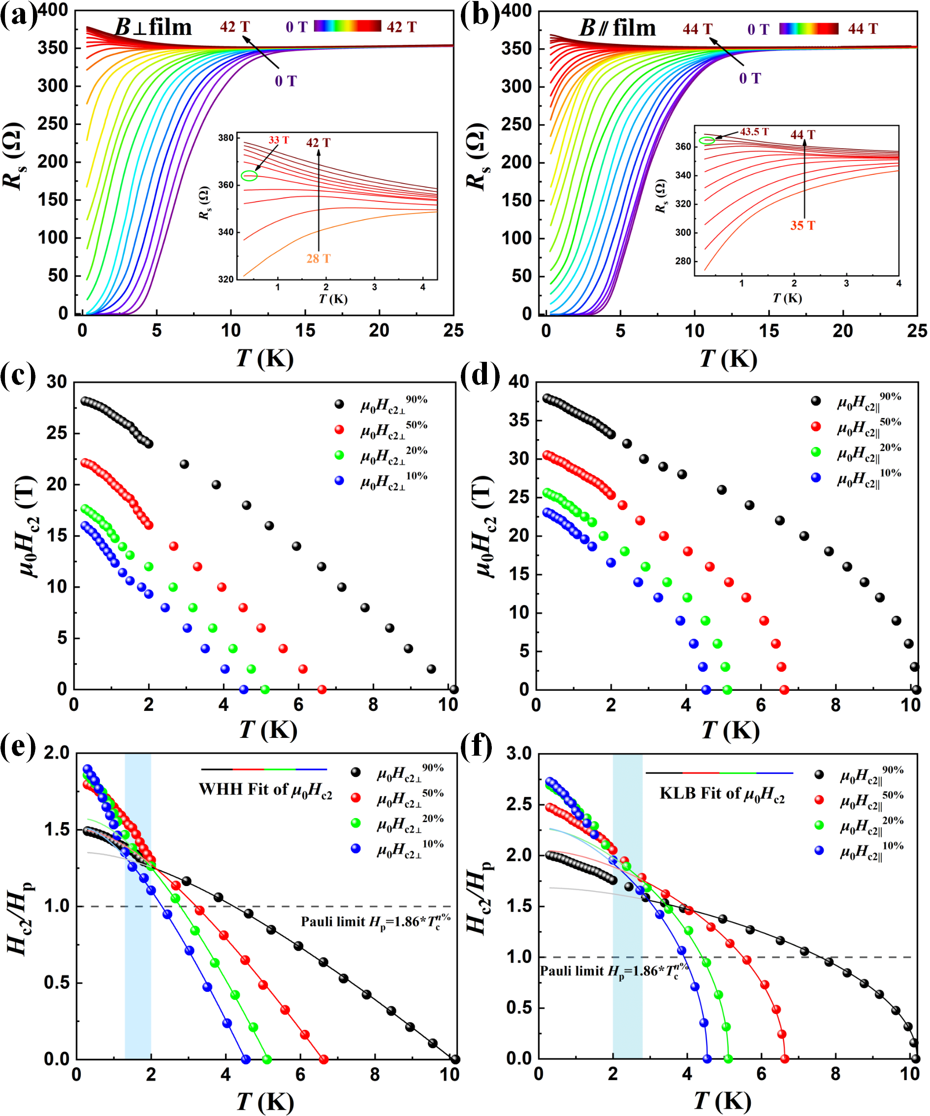 图1 | (a)垂直和(b)面内磁场下的等磁Rs(T)曲线。(c)垂直和(d)面内磁场下,不同电阻分数下的上临界场随温度的变化。(e)垂直和(f)面内磁场下,归一化上临界场Hc2/Hp(泡利极限,Hp=1.86×Tcn%)随温度的变化。