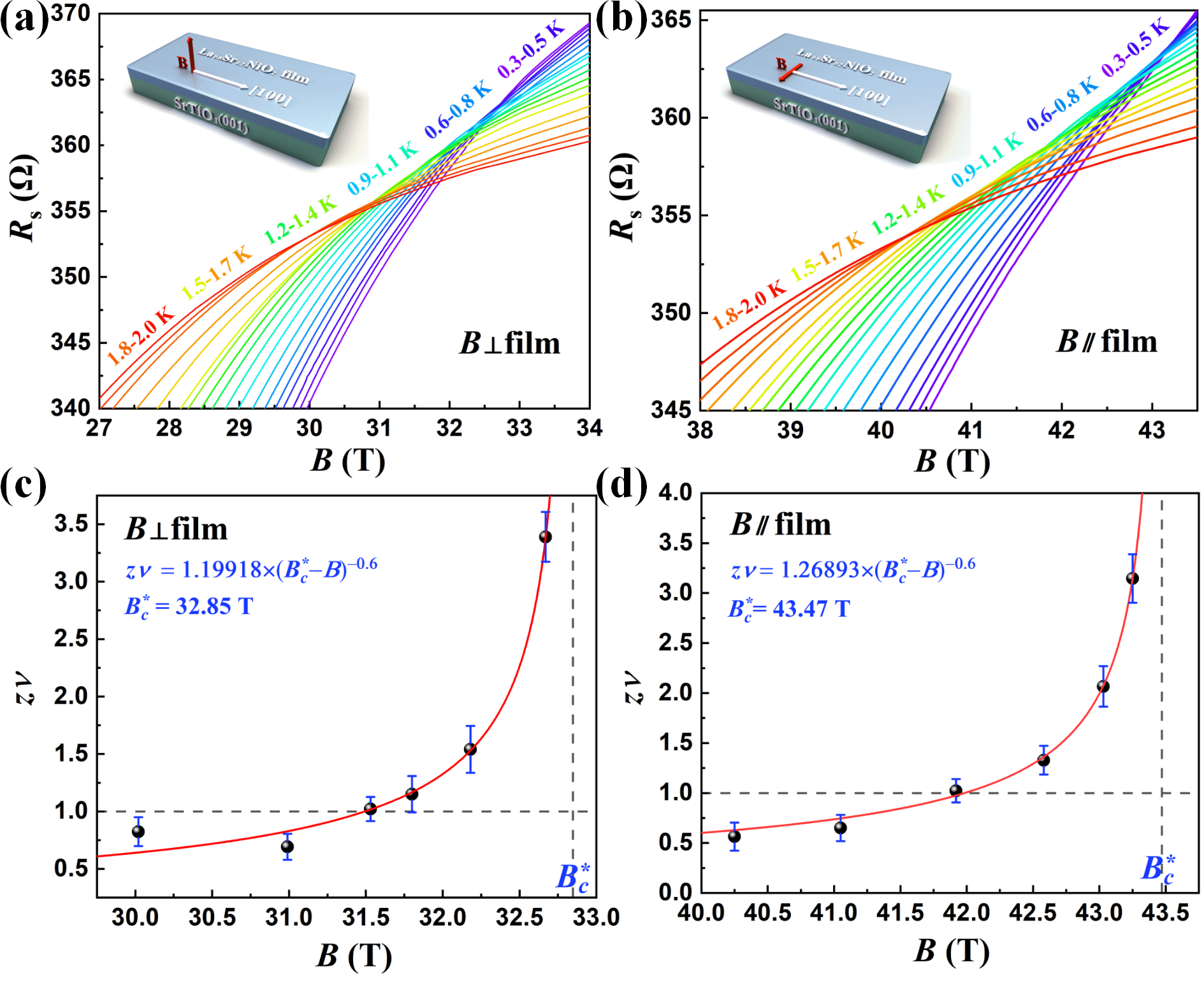 图2 | (a)垂直和(b)面内磁场下方块电阻Rs与磁场B的关系曲线。(c)垂直和(d)面内磁场下,有限尺寸标度分析给出的临界指数z。红色实线为基于激活标度定律的拟合曲线,水平的虚线表示z=1。