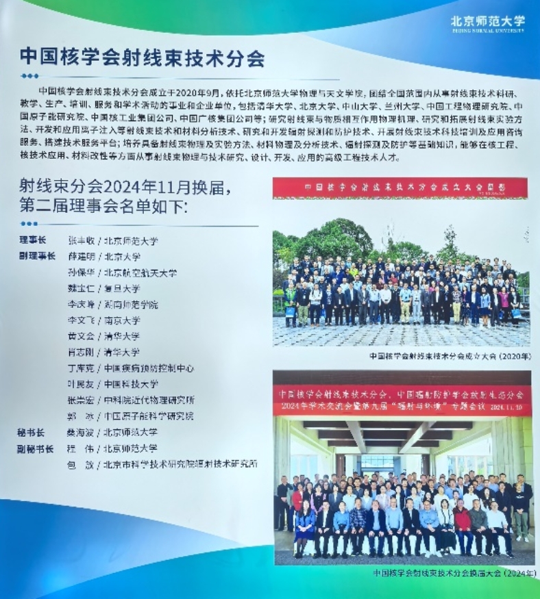 为积极响应国家原子能发展战略,北京师范大学物理与天文学院于2020年9月牵头成立中国核学会射线束技术分会。成立以来,分会广泛团结全国范围内从事射线束技术科研、教学、生产、培训、服务和学术活动的事业和企业单位,包括清华大学、北京大学、中国工程物理研究院、中国原子能研究院、中国核工业集团公司、中国广核集团公司等;研究射线束与物质相互作用物理机理和实验方法、开发和应用离子注入、辐射探测等射线束技术和材料分析技术;培养能够在核工程、核技术应用、材料改性等方面从事射线束物理与技术研究、设计、开发、应用的高级工程技术人才。分会理事长由物理与天文学院教授、国家级人才张丰收担任。
