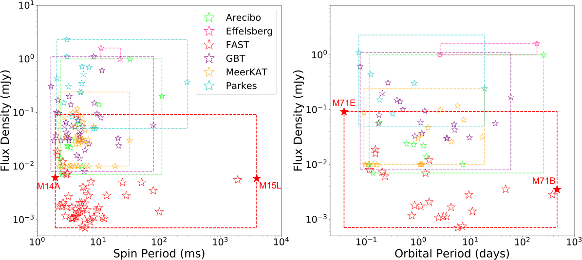 图2. 不同射电望远镜在球状星团中发现的脉冲星流量密度与自转周期(左图)及轨道周期(右图)关系。