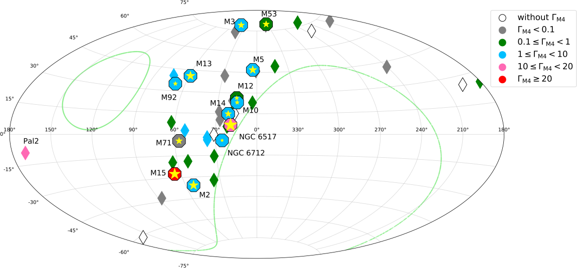 图1. FAST天区内 (-14° < δ < 47.5°) 45个球状星团的银河坐标分布和恒星相遇率测量。