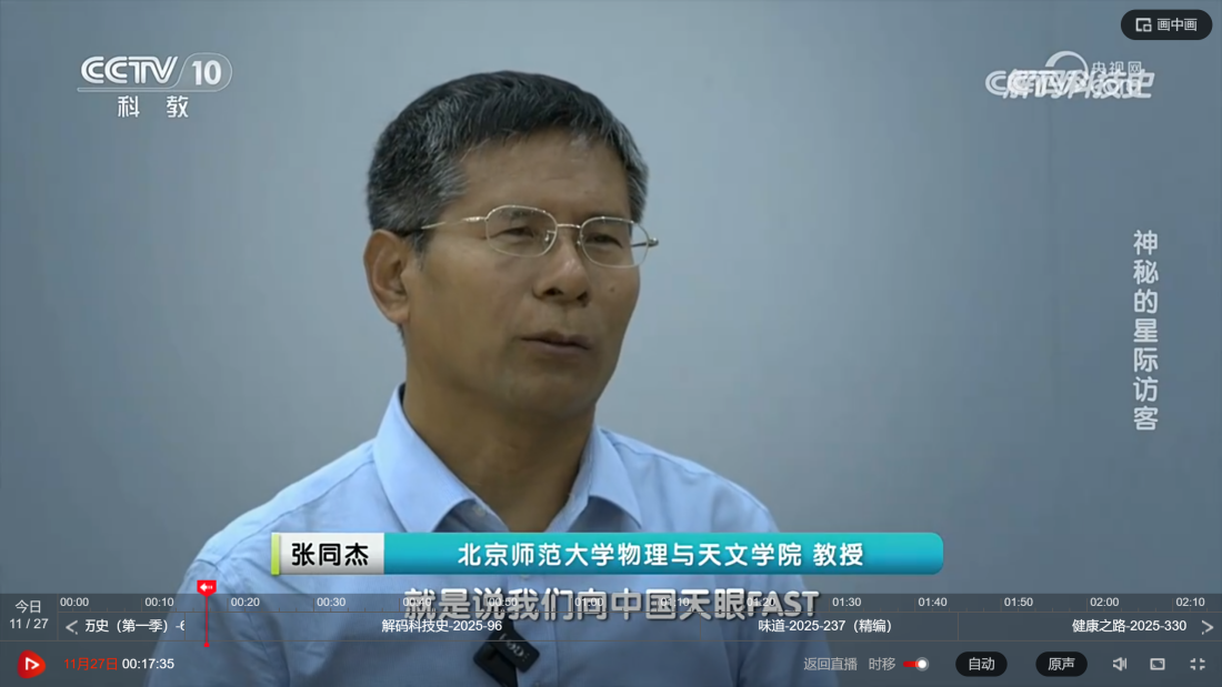 《解码科技史》“神秘的星际访客”专题节目于2025年11月27日在央视10频道播出,欢迎对星际探索与天文学研究有浓厚兴趣的爱好者观看。