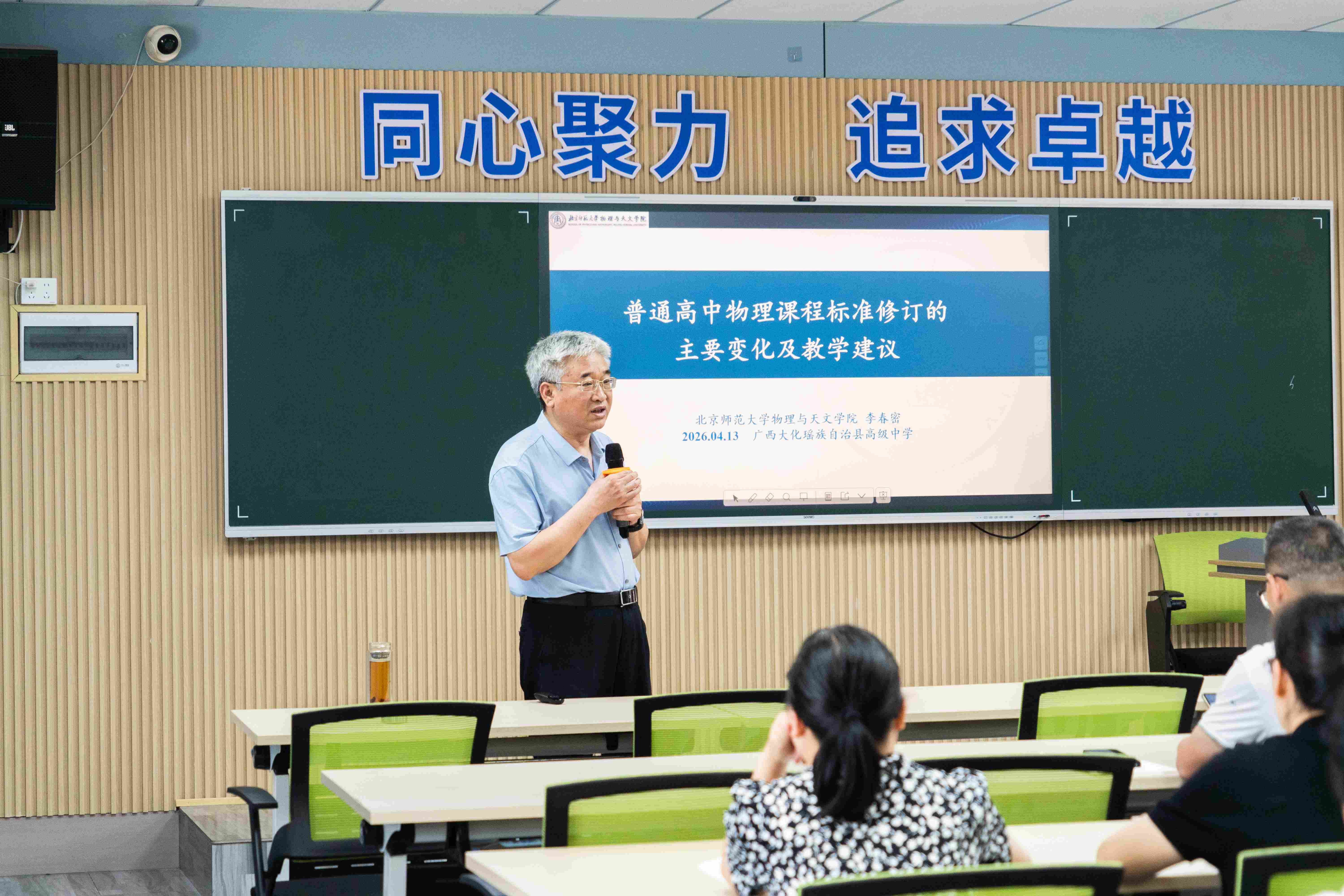 为深入贯彻新时代基础教育强师计划,落实“强师工程”服务县域教育发展的总体部署,2026年4月13日至14日,北京师范大学物理与天文学院专家团队承载着百年京师物理的深厚根脉与“强师工程”的核心使命,跨越千里,走进广西大化瑶族自治县高级中学,开展为期两天的“强师励教行”与“强师科普行”系列专题活动。活动由北京师范大学物理与天文学院主办、北京师范大学强师工程办公室支持、大化瑶族自治县科学技术协会与大化瑶族自治县高级中学承办。由北京师范大学物理与天文学院组建的强师励教与强师科普专家团队,以专题座谈会、课堂诊断指导、教师专题讲座、学生科普讲座、物理科普书单及实验室建设指导等多元形式,将高校优质教育资源精准送达县域中学,服务乡村教育振兴,探索物理学科“大中衔接、协同育人”的创新路径。