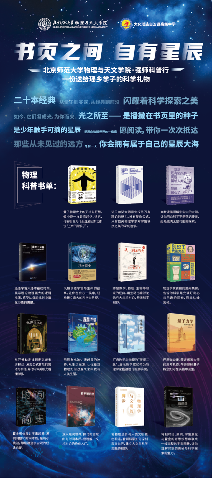 座谈会最后,举行了温馨而庄重的赠书仪式。桑海波副院长代表北师大物理与天文学院向大化高中赠送了一批精心挑选的物理科普书籍。这份物理科普书单既有量子物理、宇宙探索等前沿领域的佳作,也有物理学史、科学家传记等启迪心智的经典读物,承载着北师大物天人对瑶乡学子最殷切的期盼。