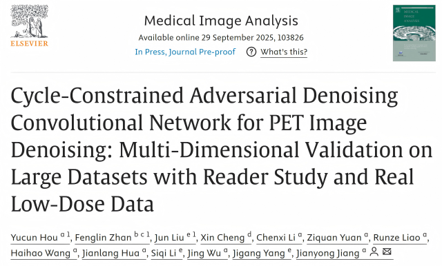 近日,北京师范大学物理与天文学院江建勇副教授团队在低剂量PET图像去噪研究中取得重要突破,提出了一种新型循环约束对抗去噪卷积网络(Cycle-DCN),实现在大幅降低辐射剂量的同时,恢复出接近标准剂量的高质量PET图像。该成果发表于医学图像分析领域顶级期刊《Medical Image Analysis》(影响因子11.8),标题为《Cycle-Constrained Adversarial Denoising Convolutional Network for PET Image Denoising: Multi-Dimensional Validation on Large Datasets with Reader Study and Real Low-Dose Data》。