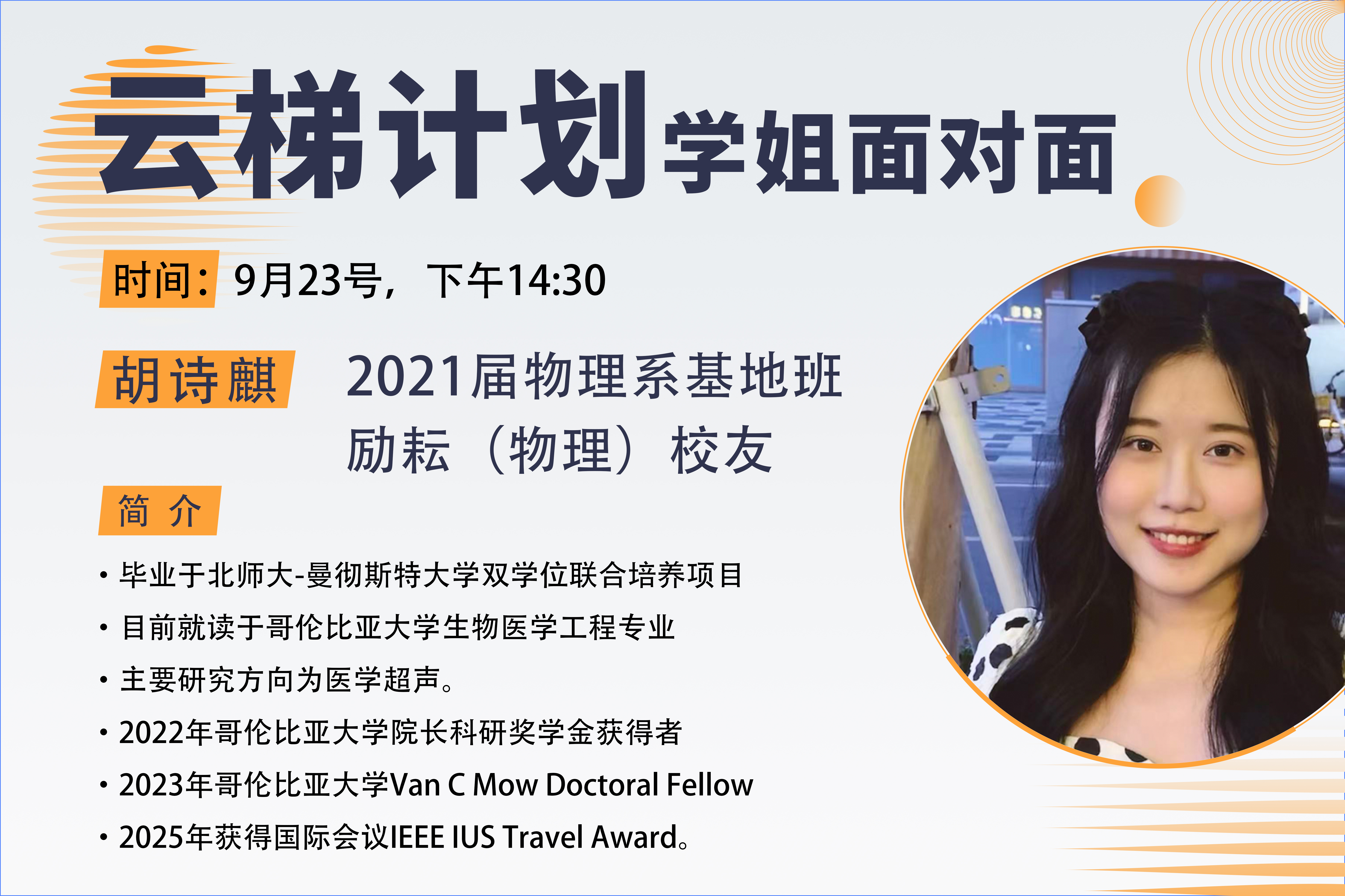 2025年9月23日下午,云梯计划“学姐面对面”留学经验分享活动在物理楼106成功举办。本次活动邀请到物理学专业2021届校友胡诗麒来为同学们分享她的留学经验。